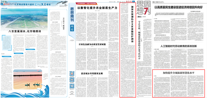 唐元副教授的《加快提升全域旅游智慧化水平》(安徽日报·理论版)立足安徽省智慧旅游创新发展新指引,提出了以“新基建”重构全域旅游空间格局、以技术融合创新全域旅游产品业态、以智能算法重塑全域旅游服务范式、以机制协同赋能全域旅游保障体系的四维发展体系。文章以全域视野深入探讨了文旅消费智慧转型的技术赋能、数据驱动、业态创新路径,助力安徽从旅游资源大省向智慧旅游强省的跨越式发展。