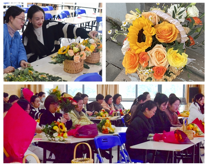 教职工活动室里,校工会主办、经济与管理学院分工会承办的“魅力巾帼 花漾年华”主题插花活动正在如火如荼地举行。活动现场,花艺师向大家介绍了鲜花的品种并详细讲解了插花的技巧与方法。教职工们充分发挥创造力,用灵巧的双手完成了一束束插花作品,营造了浓厚的节日氛围。